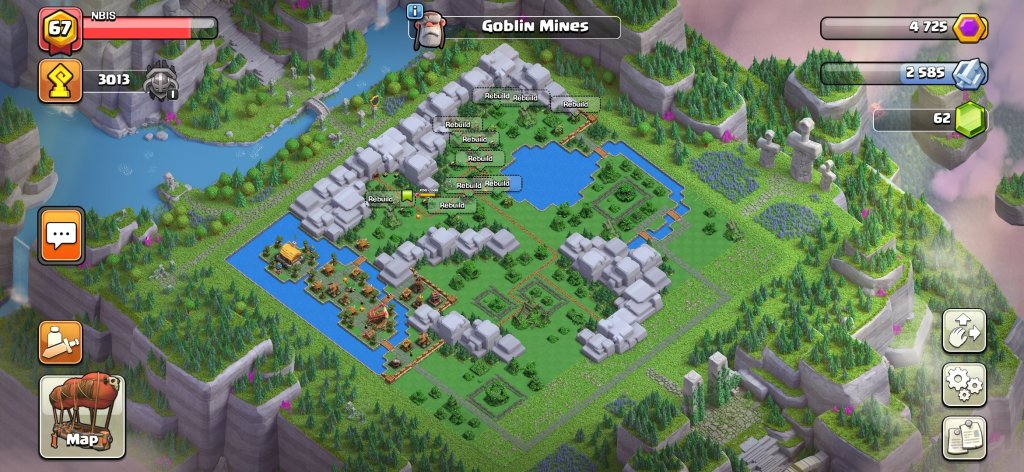 The Clan Capital District boasts rolling mountains and flowing rivers, serving as natural fortifications. Goblins have settled here to tap into its resources, and Capital Base Builders will discover abundant opportunities for base designs that make the most of the terrain. These towering mountains and rivers naturally hinder ground Troops attempting to raid Goblin Mines.